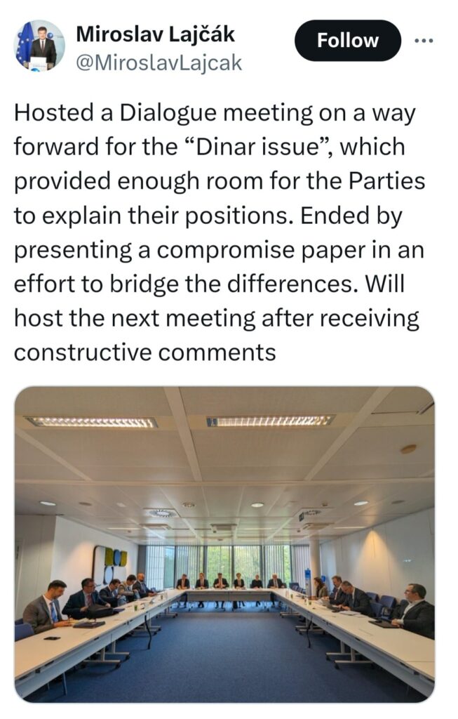 “Prita një takim nga Dialogu për të gjetur një zgjidhje për “çështjen e dinarit”. Ky takim u dha hapësirë të mjaftueshme palëve për të shpjeguar qëndrimet e tyre”.