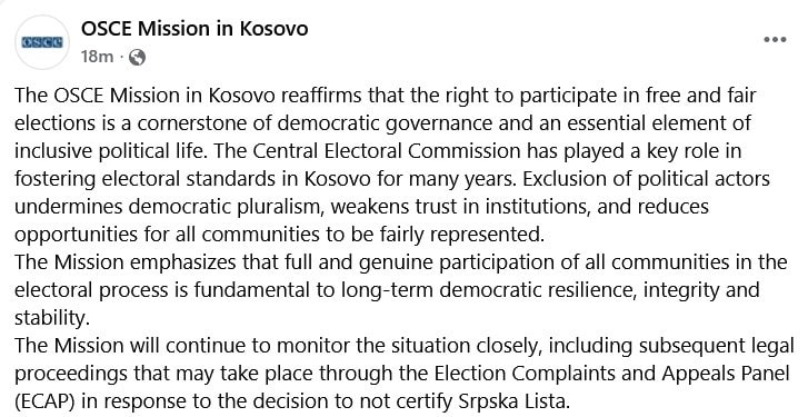 Misioni i OSBE-së në Kosovë ka reaguar pas vendimit të Komisionit Qendror të Zgjedhjeve për moscertifikimin e Listës Serbe për zgjedhjet lokale të 12 tetorit, duke theksuar rëndësinë e pjesëmarrjes së plotë të të gjitha komuniteteve në procesin zgjedhor dhe ruajtjen e pluralizmit demokratik.