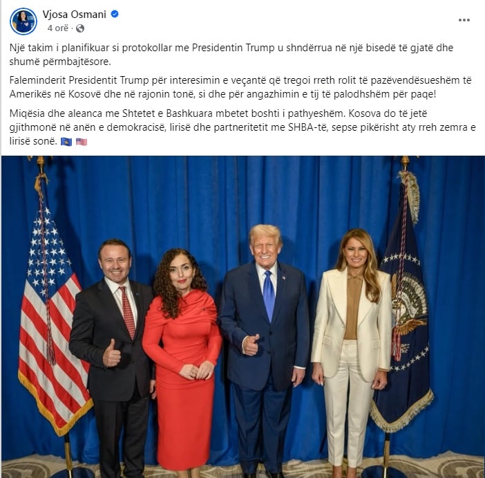 “Një takim i planifikuar si protokollar me presidentin Trump u shndërrua në një bisedë të gjatë dhe shumë përmbajtjesore. Faleminderit presidentit Trump për interesimin e veçantë që tregoi rreth rolit të pazëvendësueshëm të Amerikës në Kosovë dhe në rajonin tonë, si dhe për angazhimin e tij të palodhshëm për paqe”, ka shkruar Osmani në Facebook.